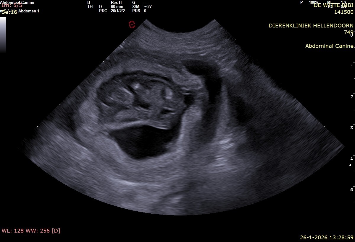 Onlangs is onze Bibi op date geweest met Ozzy (Aristocrat Astronaut) Beide ouderdieren zijn HD-A, ED vrij en ECVO vrij getest. Uit de 4 weekse echo is gebleken dat Bibi drachtig is. We hopen omstreek 27 Februari 2026 een nestje Bouvierpups te verwachten.